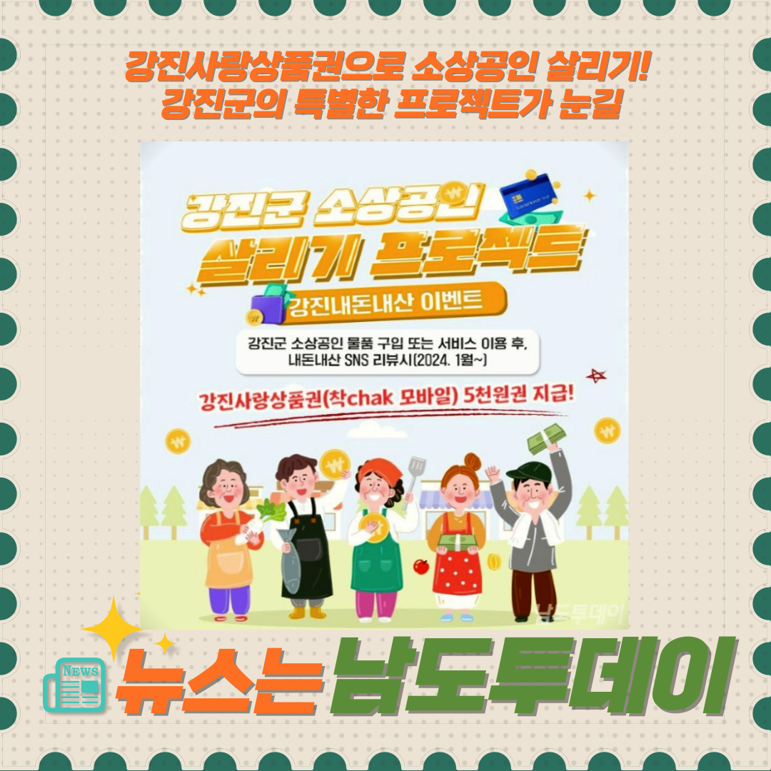 이 프로젝트는 강진군 내 소상공인 업체를 이용하고 그 경험을 SNS에 공유하는 것으로, 참여자에게는 강진사랑상품권 5,000원이 지급된다.