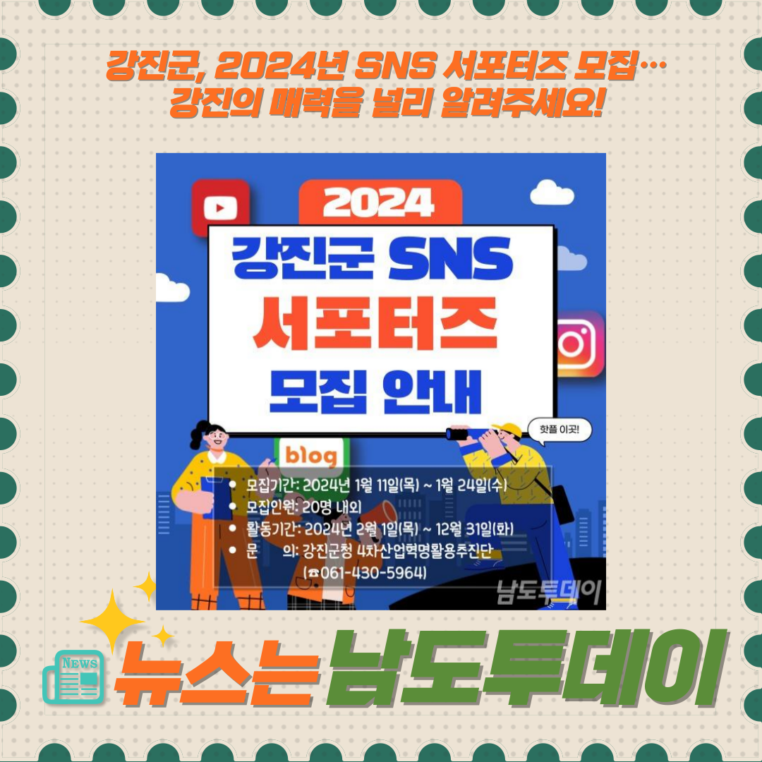 모집 기간은 24일까지입니다. 활동은 강진군 공식 SNS 게시글에 공감과 댓글 작성, 개인 SNS를 통한 군정 소식 공유 등을 포함합니다.