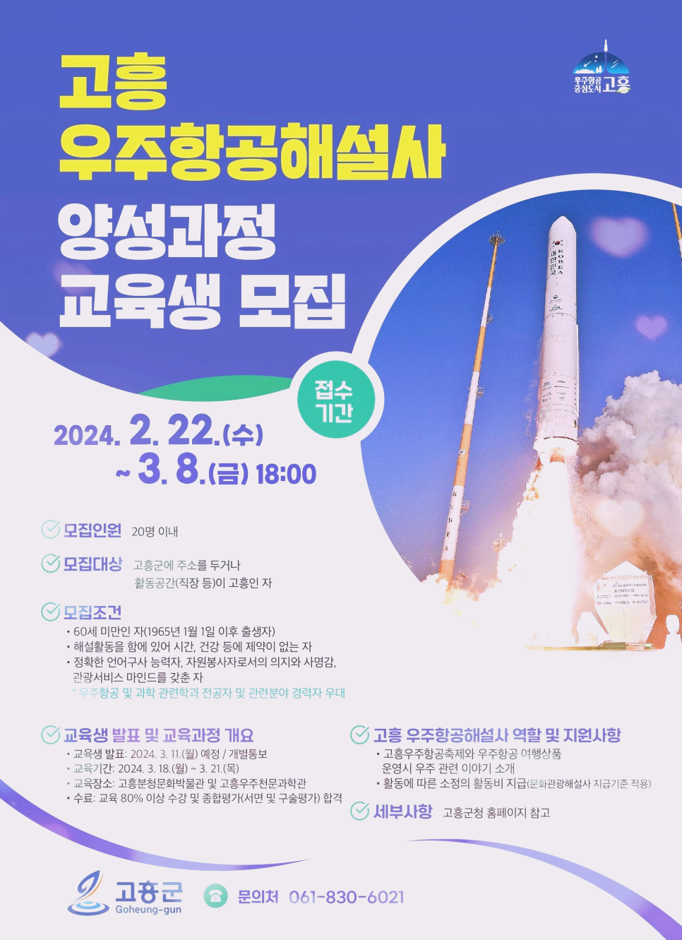 - 모집대상: 고흥군에 주소를 둔 자, 활동공간(직장 등)이 고흥인 자