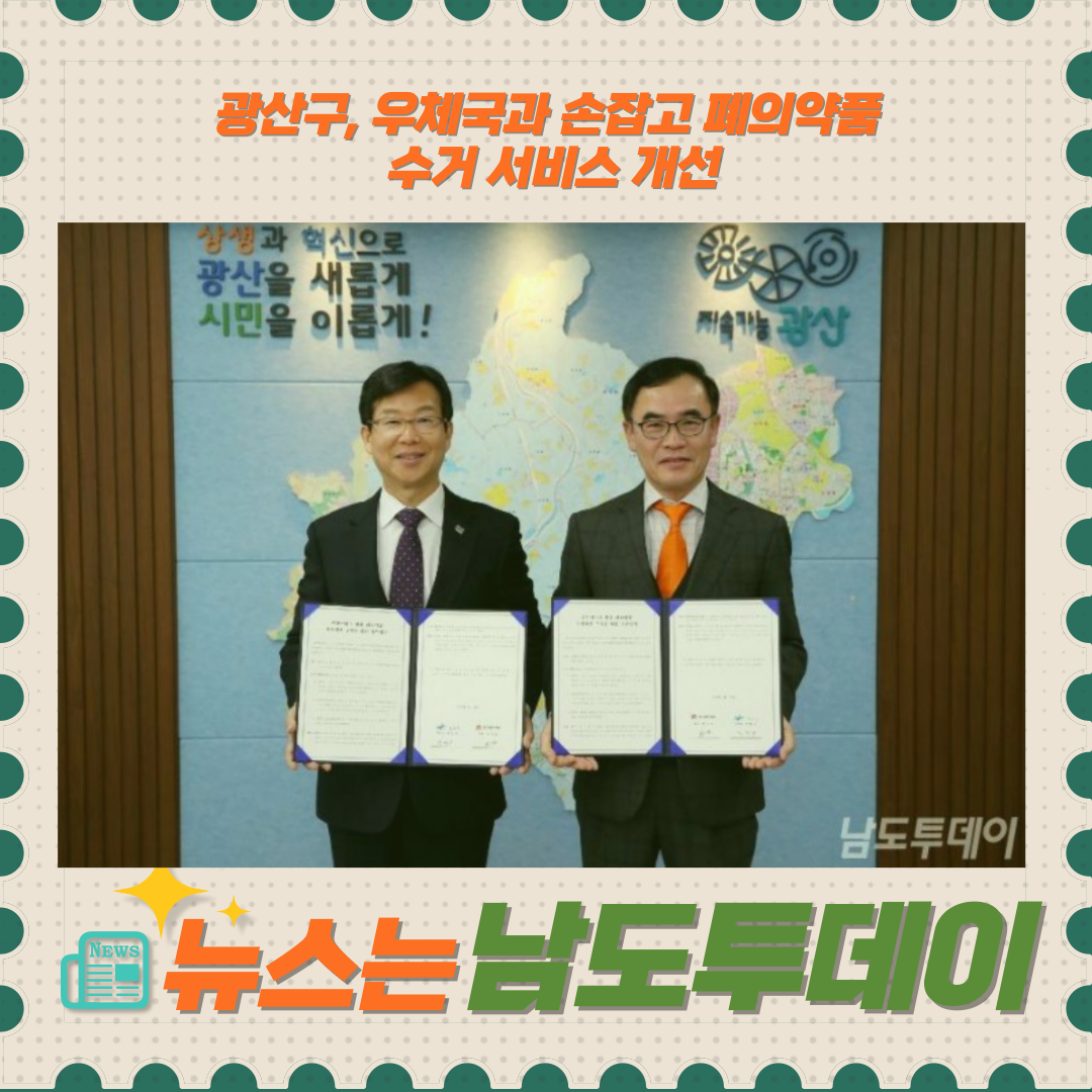 광주 광산구는 광주광산우체국과 협력해 폐의약품 수거 서비스를 새롭게 개선하고자 합니다. 최근 광산구청에서 광주광산우체국과 함께 '우편서비스망 활용 폐의약품 회수를 위한 업무협약'을 체결하였습니다.