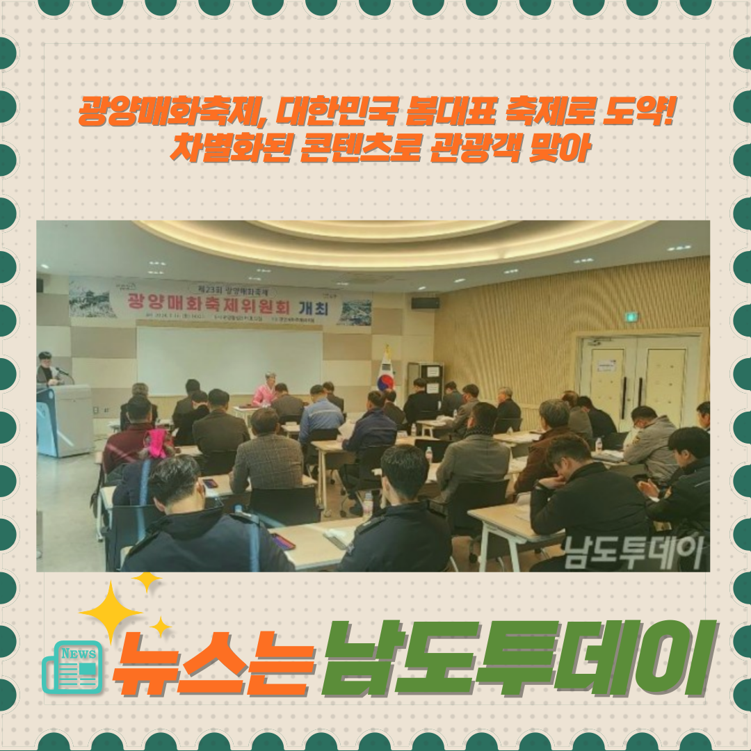 지난 16일, 광양시는 제23회 광양매화축제의 성공적 개최를 위해 광양매화축제위원회(이하 '위원회') 회의를 개최했습니다. 이날 회의에서는 30여 명의 위원 및 관계 공무원이 축제 기본계획(안)에 대한 설명을 들으며 축제 기간, 입장료 징수, 광양매화축제 명칭 등을 심도 있게 논의했습니다.