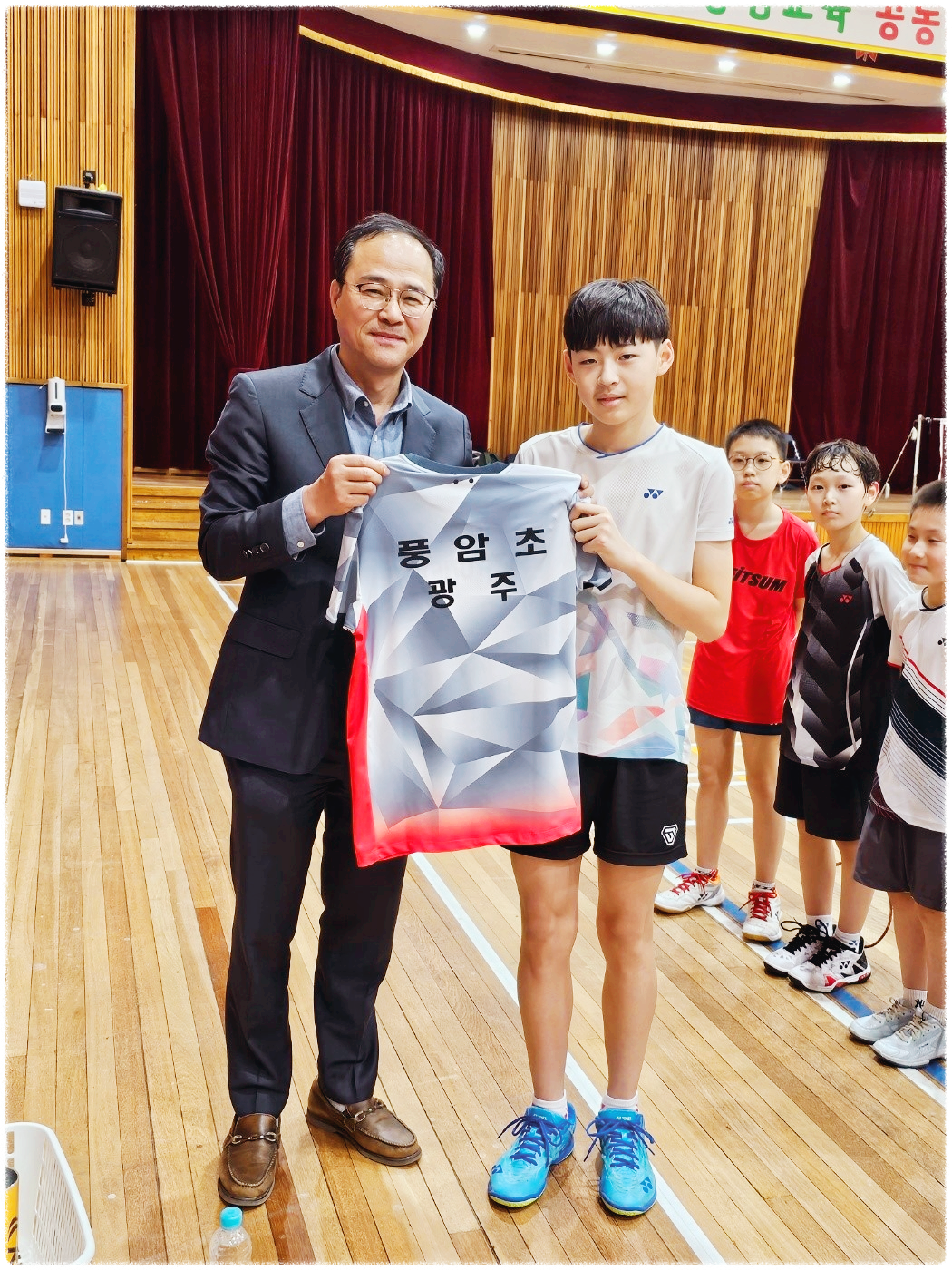 서구배드민턴협회 주최로 엘리트 초등 배드민턴 선수들을 위한 특별한 자리가 마련됐다. 지난 3월 19일 서구배드민턴협회 김영천 회장(영창건설 대표)이 직접 풍암초등학교를 방문해 선수들을 격려했다.