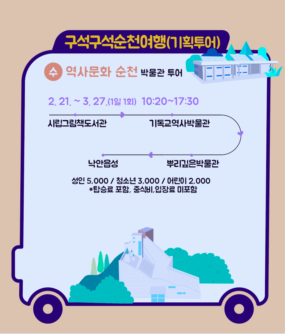 순천시(시장 노관규)는 오는 20일부터 순천의 구석구석을 여행하는 기획투어 “구석구석 순천여행” 코스를 시티투어에 추가하여 운행한다고 밝혔습니다.