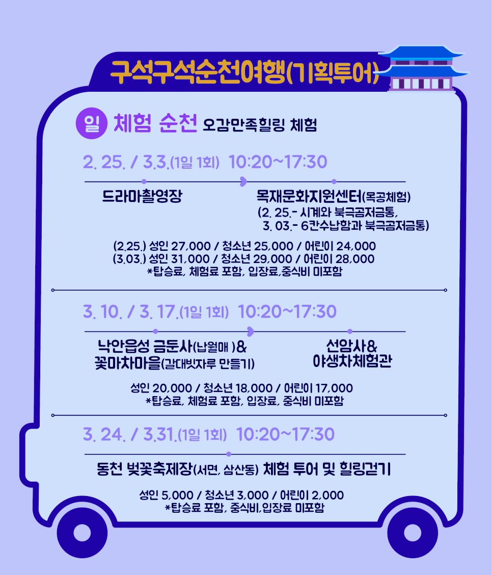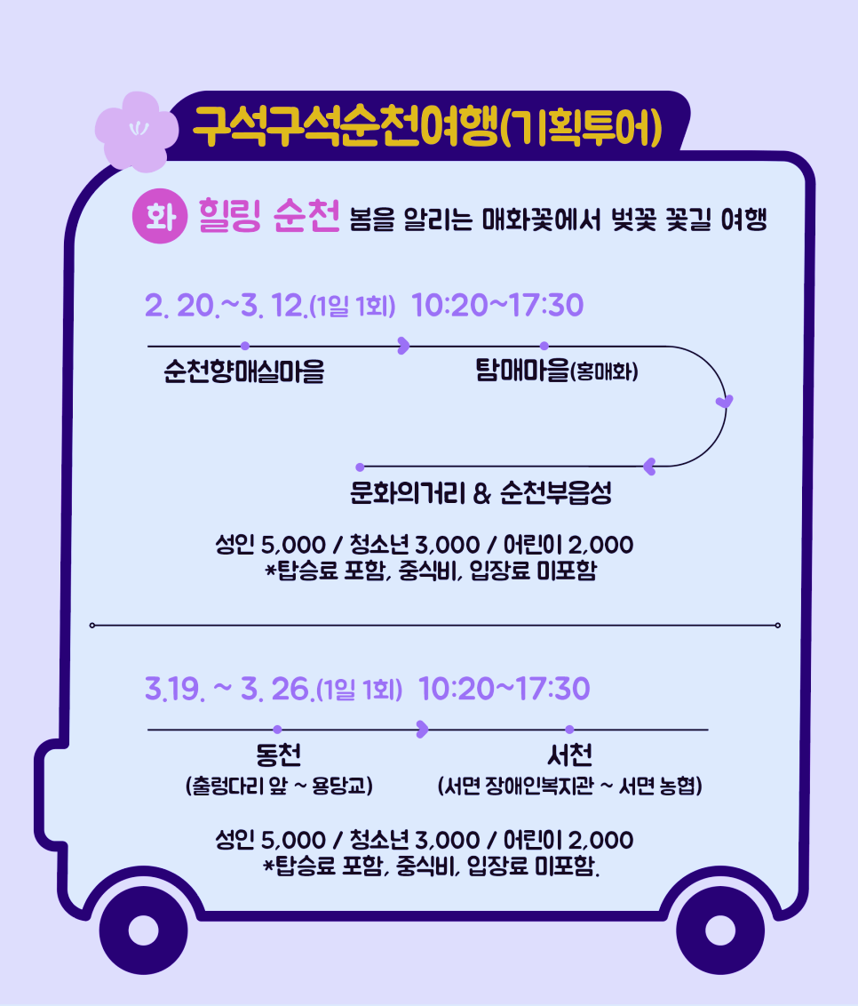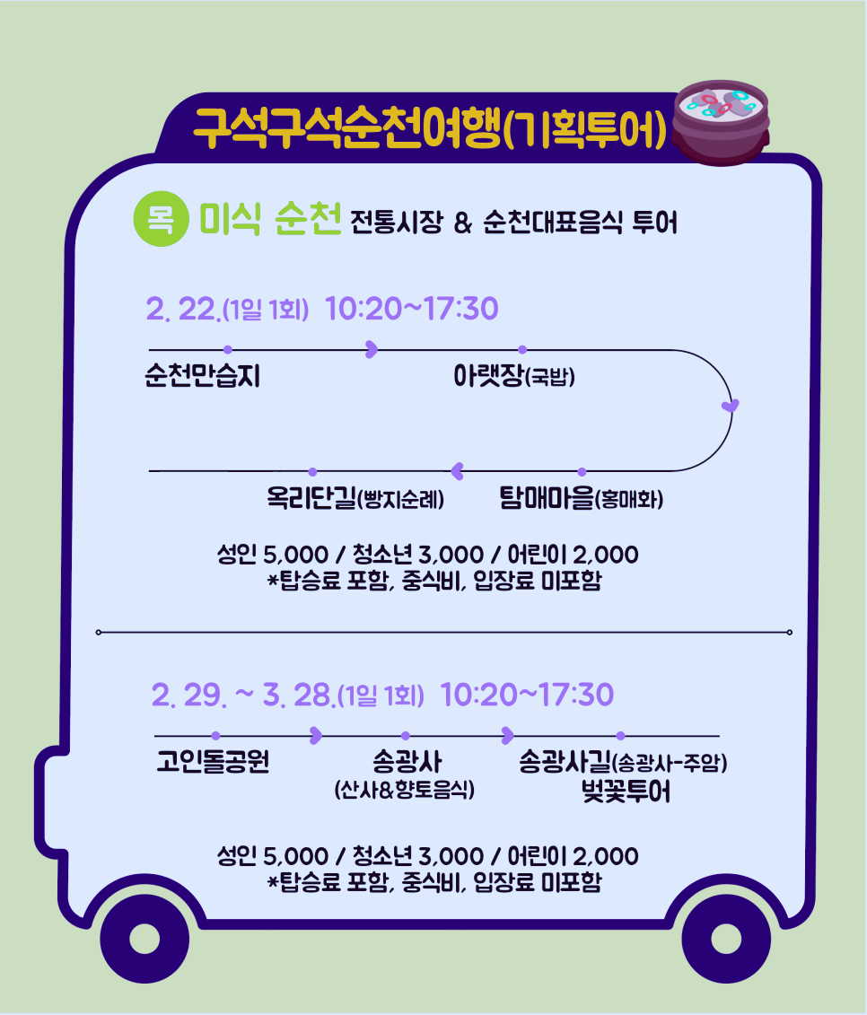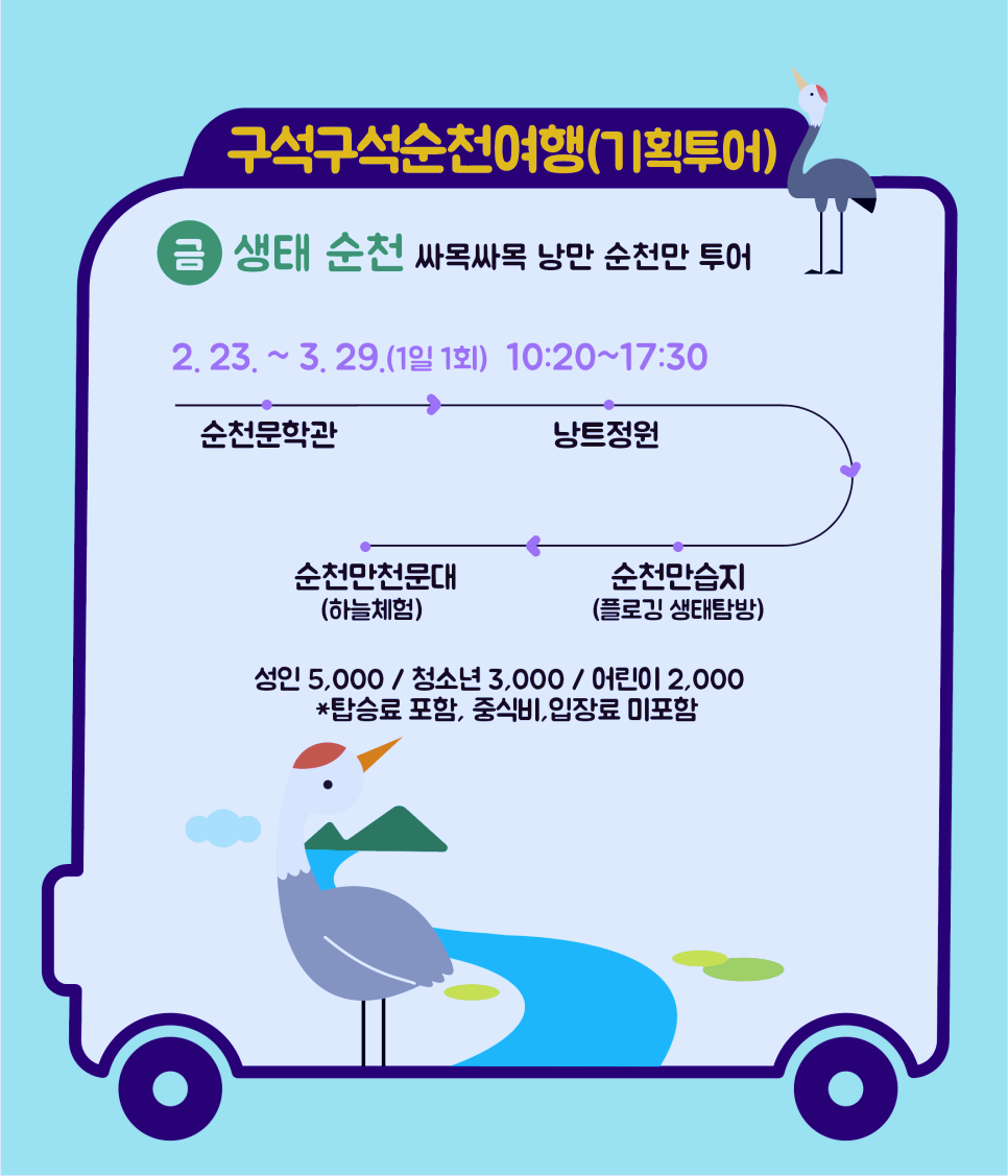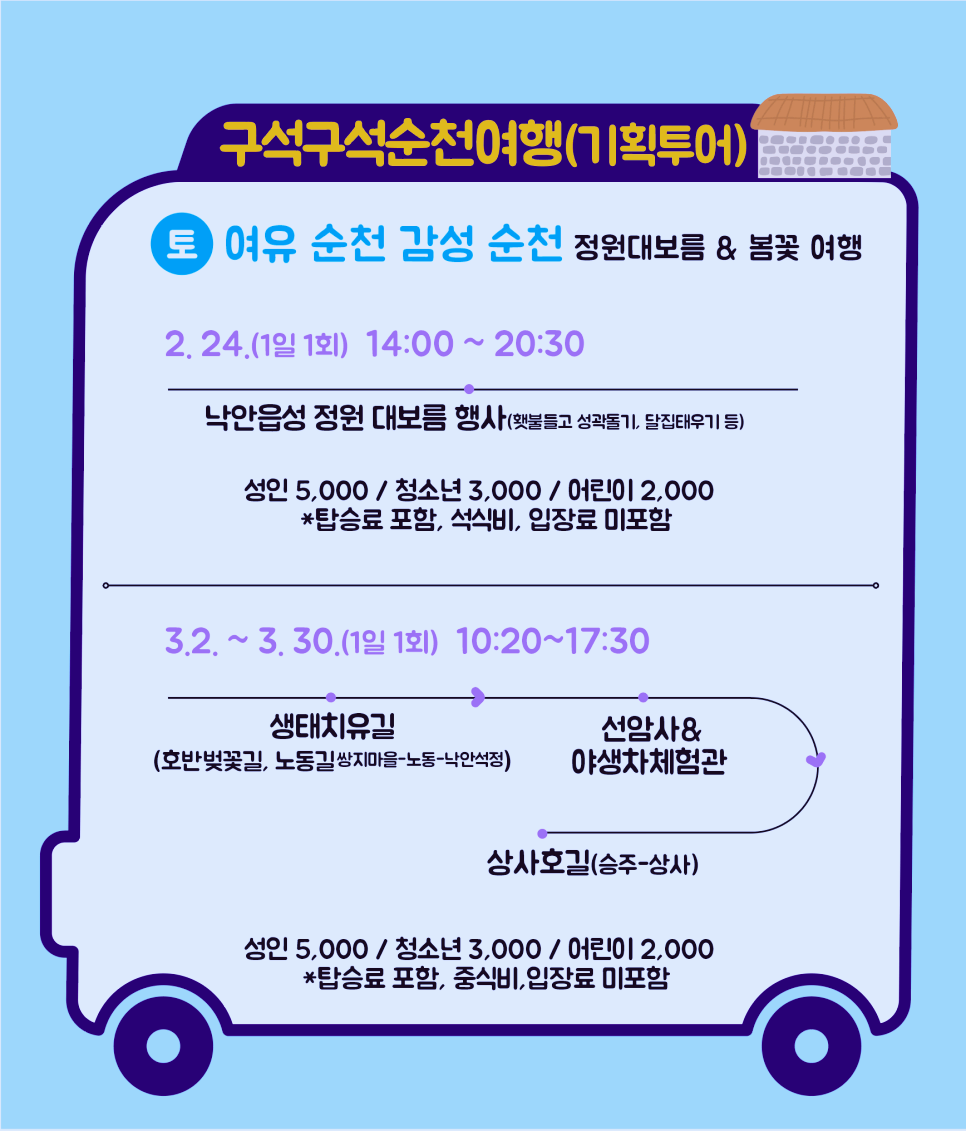 이번에 개편된 기획투어는 원래 순환형 노선이었으며, 계절별, 축제별, 마을별 테마와 연계하여 매월 변경되어 운행됩니다. 20일부터 3월까지는 “순천의 봄”을 주제로 운행됩니다.