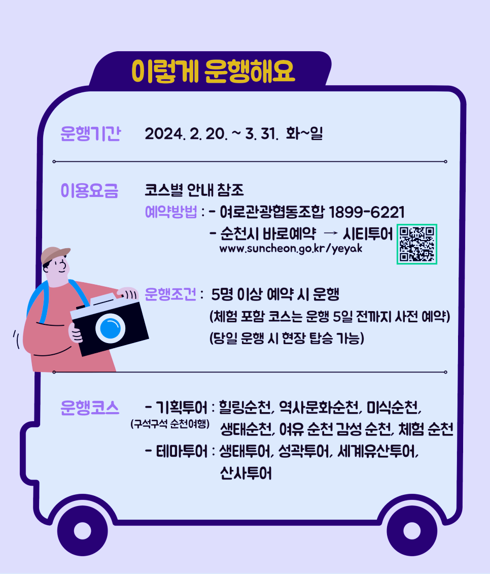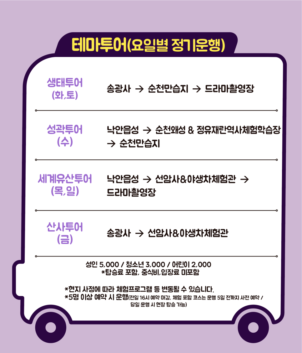 순천 시티투어 이용요금, 코스 등 상세 내용 확인과 온라인 예약은 순천시 바로예약(www.suncheon.go.kr/yeyak)에서