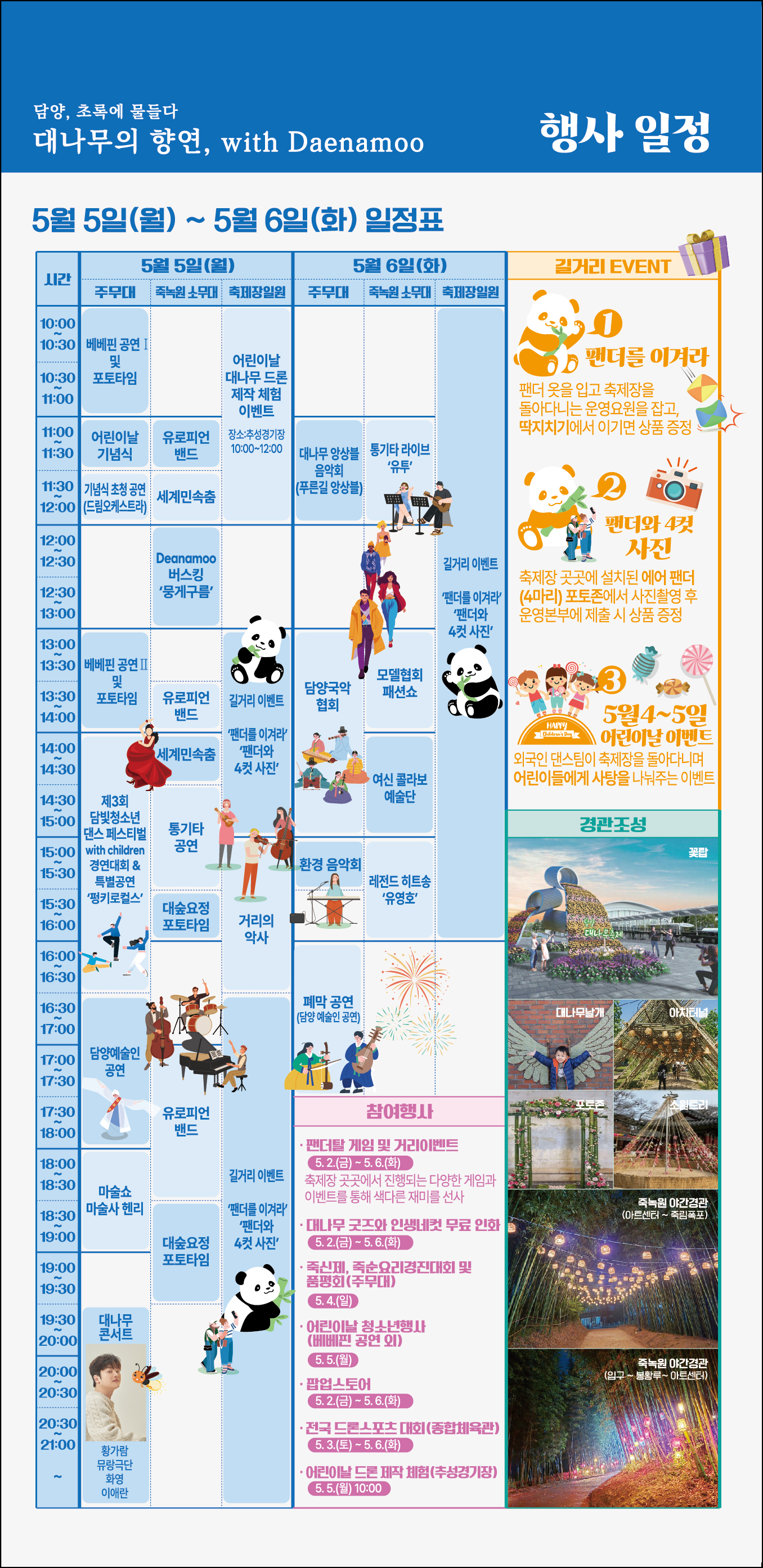 이번 담양대나무축제는 황금연휴 기간 내내 방문객들의 눈과 귀를 즐겁게 할 알찬 프로그램들로 가득합니다.