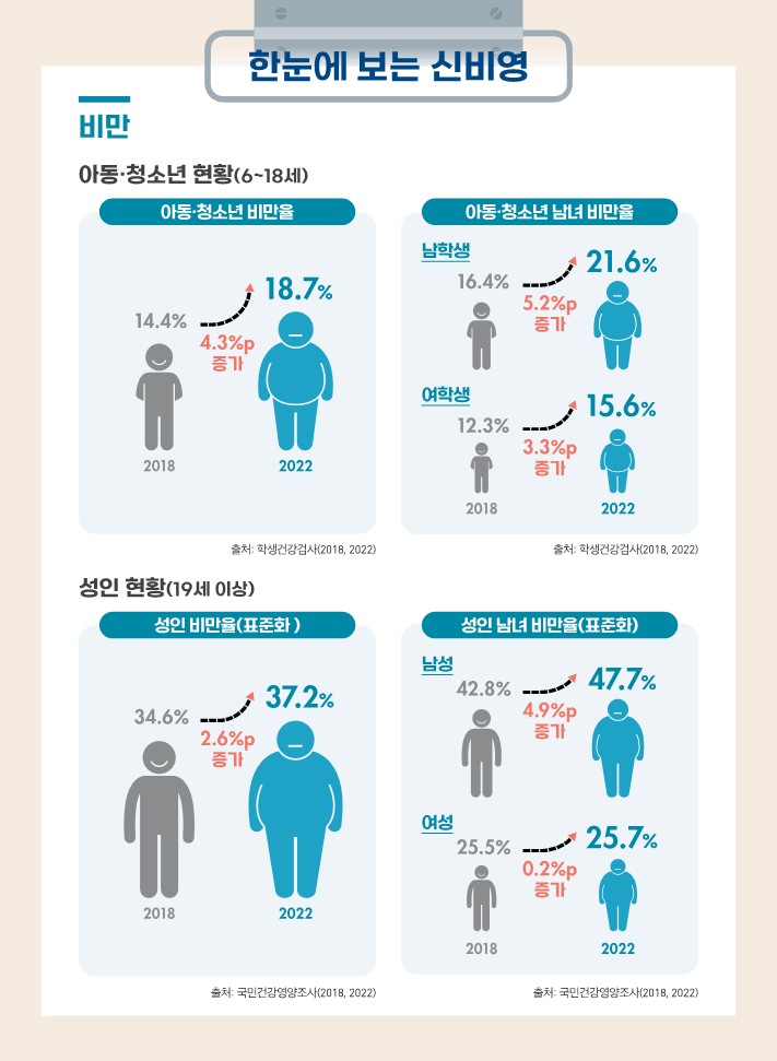 보건복지부 정연희 건강증진과장은 "국내 비만 인구가 지속 증가하는 상황에서 비만에 대한 경각심을 일깨우고, 국민 일상에 건강한 식생활 실천 문화를 확산하기 위해 이번 캠페인과 통계자료집 발간을 기획했다"라고 밝혔습니다.