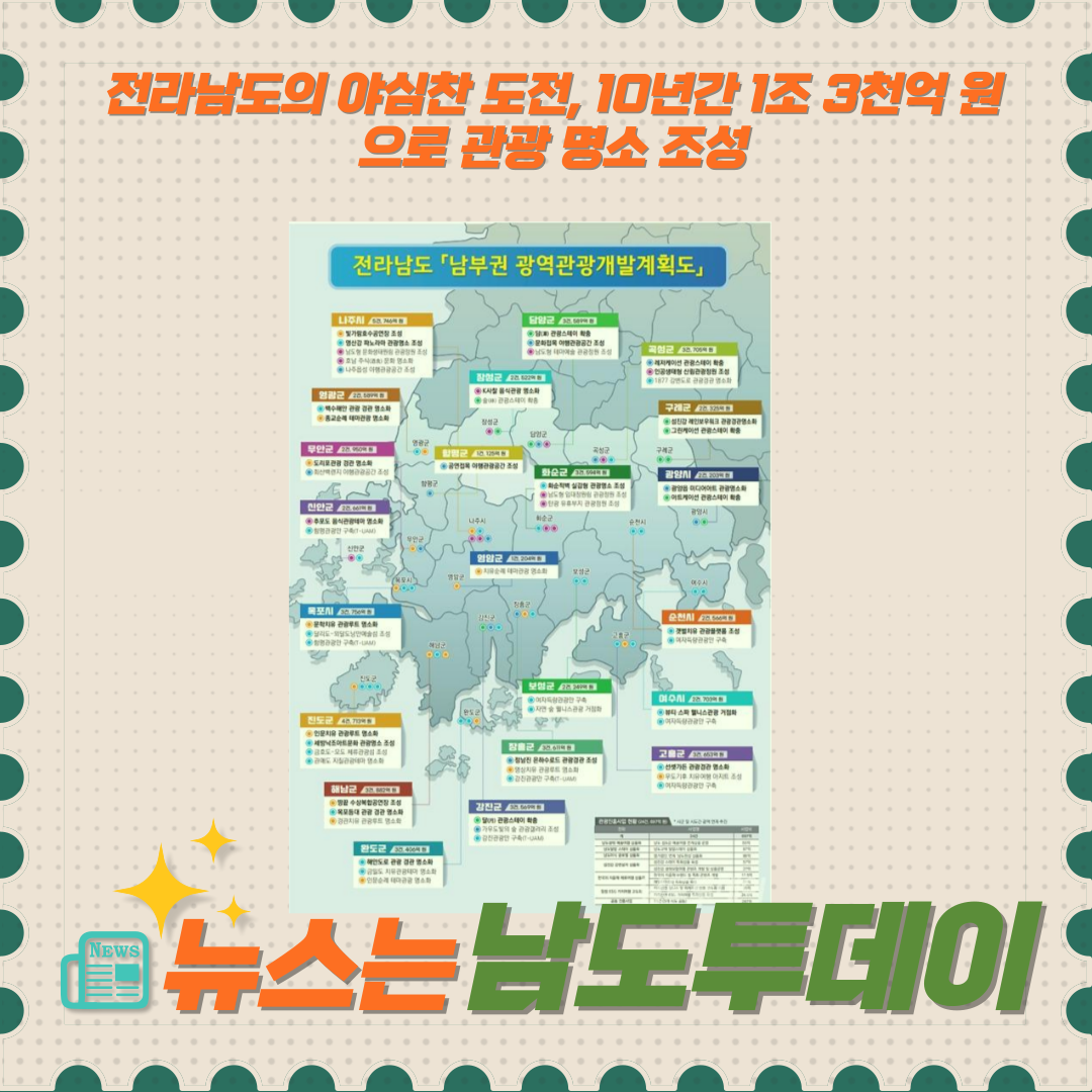 "전라남도, 10년 동안 1조 3천억 원으로 전국 최대 규모 관광 개발 사업 추진"