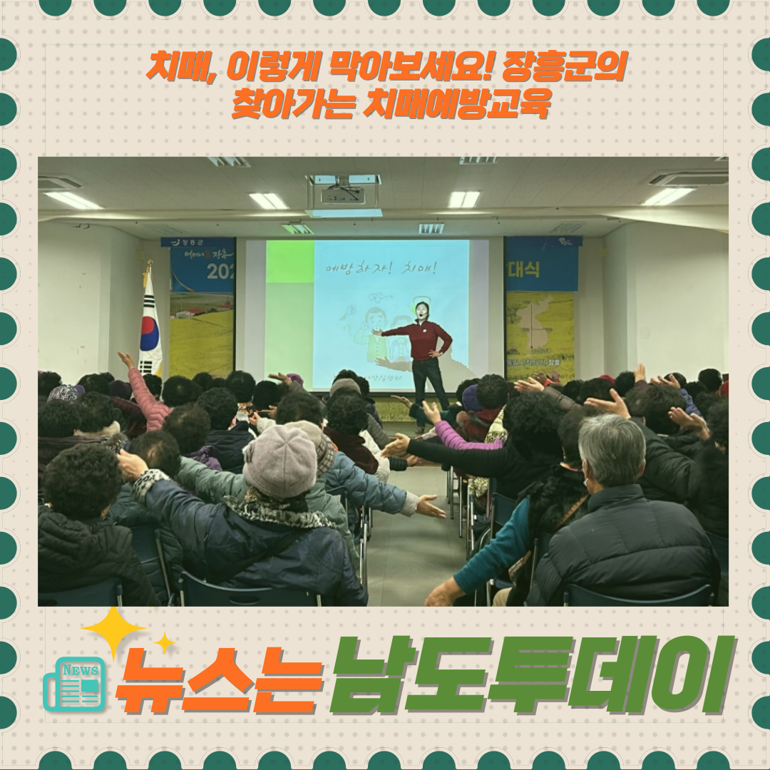 장흥군은 치매 발생 위험 요인을 파악하고, 발병 시기를 늦추기 위한 치매 예방 방법을 알리기 위해 '찾아가는 치매예방교육'을 실시한다고 발표했습니다.