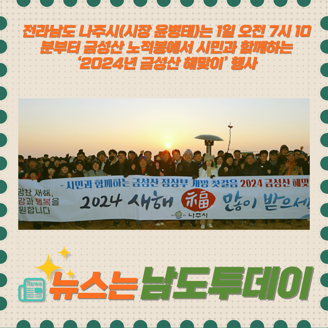 전라남도 나주시(시장 윤병태)는 1일 오전 7시 10분부터 금성산 노적봉에서 시민과 함께하는 '2024년 금성산 해맞이' 행사를 개최했다고 발표했습니다.
