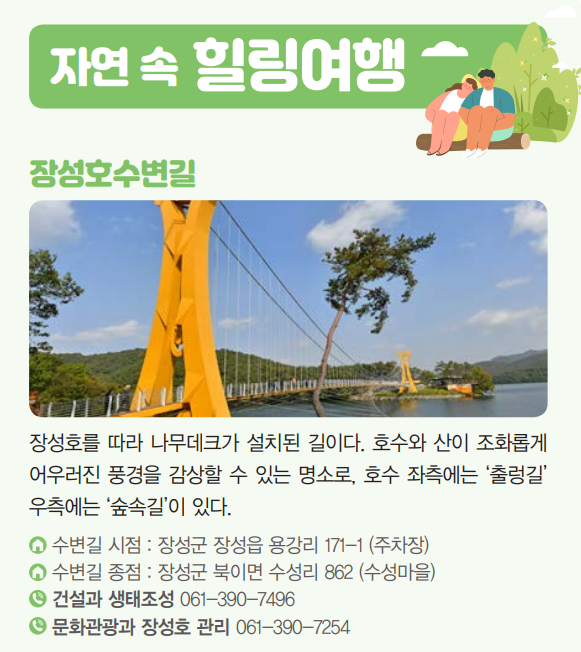 - 스탬프 투어: 축령산 편백숲, 백양사, 유네스코 세계유산 필암서원, 장성호 수변길, 홍길동테마파크 중에서 세 곳 이상 방문하고 인증 사진과 인증 도장을 받으면 장성역 '여행자 플랫폼'에서 소정의 선물을 증정합니다.
